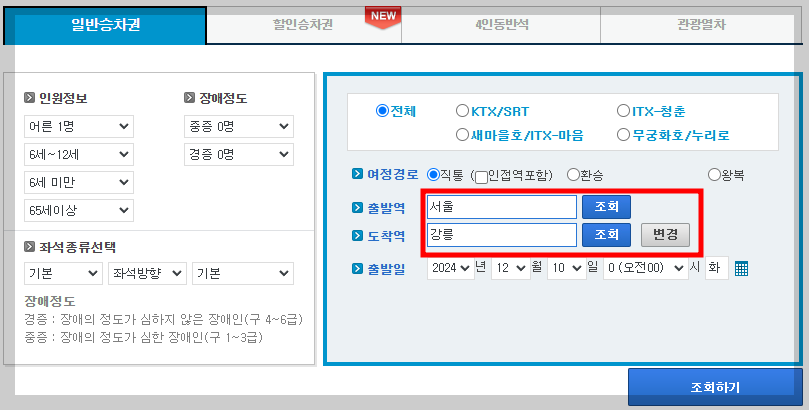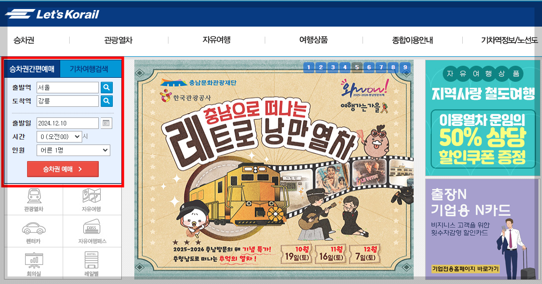 화면의 좌측 코너에 [승차권 간편예매]하기 화면에서 [출발역 / 도착역 / 출발일]을 설정해 보세요.