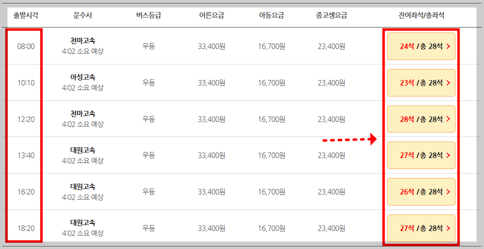 3️⃣ 출발이 가능한 시간대를 확인 및 잔여좌석을 체크합니다.