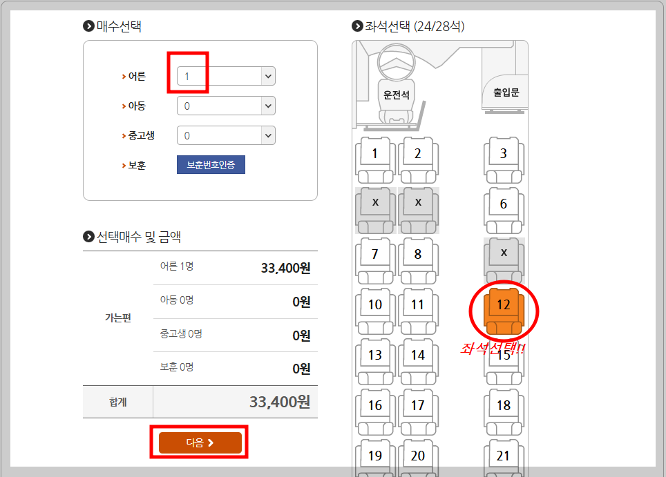 원하는 시간대의 버스를 선택하면, 화면에 보이는 것처럼 좌석 선택을 의자 이미지 중