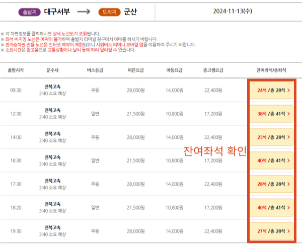 - 출발이 가능한 시간대를 확인하고, 잔여좌석 비교체크한 후, 원하는 시간대를 선택합니다.