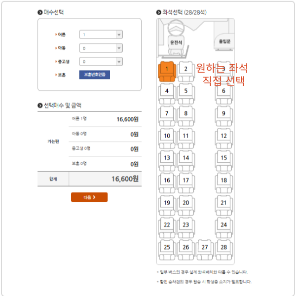원하는 시간대의 버스를 선택했다면, 원하는 좌석을 클릭 한 번으로 선택할 수 있는데요.