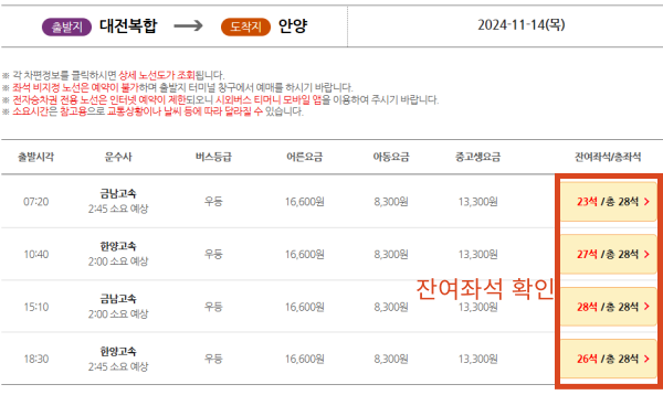 - 출발이 가능한 시간대를 확인하고, 잔여좌석 비교체크한 후, 원하는 시간대를 선택합니다.