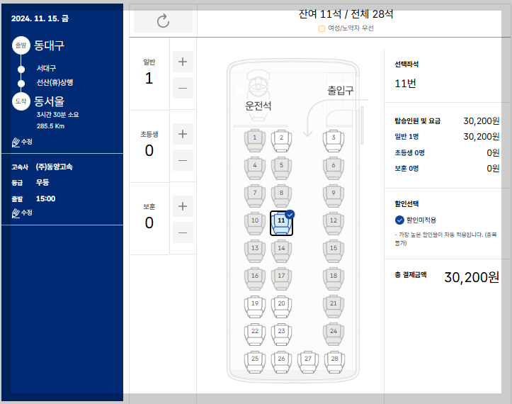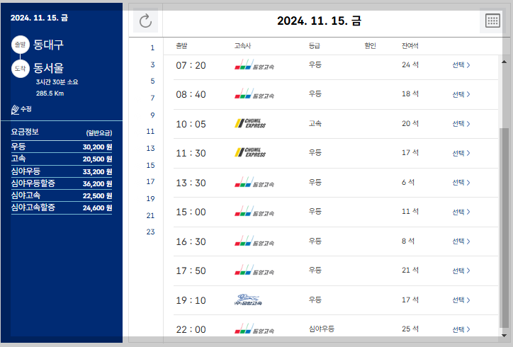 ● 출발일자의 시간대별 등급별 버스 시간표 및 좌석 정보를 확인할 수 있습니다.