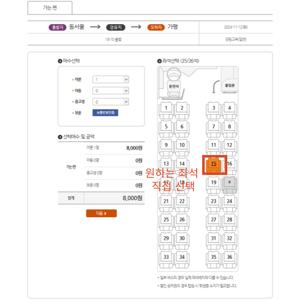 원하는 시간대의 버스를 선택한 후, 원하는 좌석을 클릭 1번으로 선택할 수 있습니다.