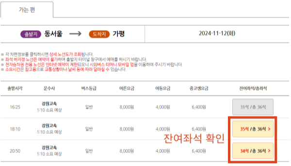 출발시각과 예상 소요시간, 이용요금 및 잔여좌석을 확인할 수 있습니다.