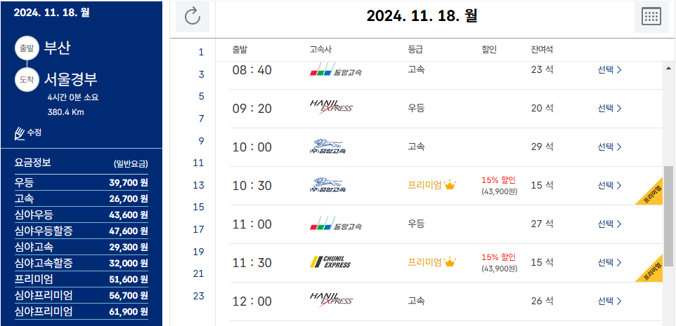 ● 고속버스터미널 시간표 조회가 완료 되면, 원하는 시간표와 버스등급을 선택합니다.