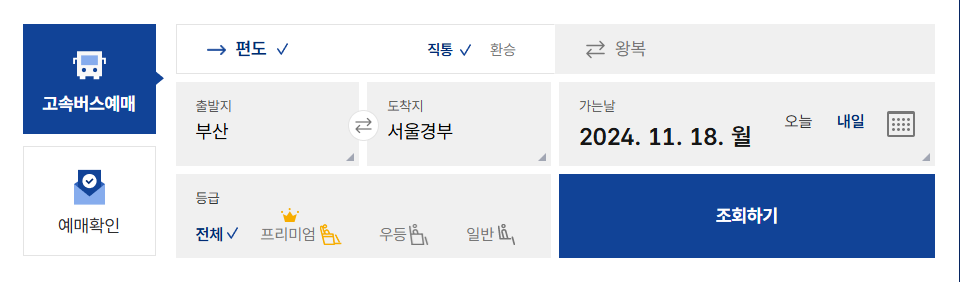 ● 출발지를 "부산 고속버스터미널"로 설정하고, 도착지를 이동하고자 하는 도시로 선택합니다.