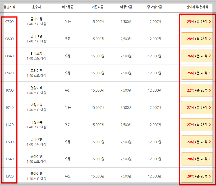 특히, 출발 시간이 가까워졌거나 인기 노선을 이용할 경우 좌석이 빠르게 매진될 수 있으니,