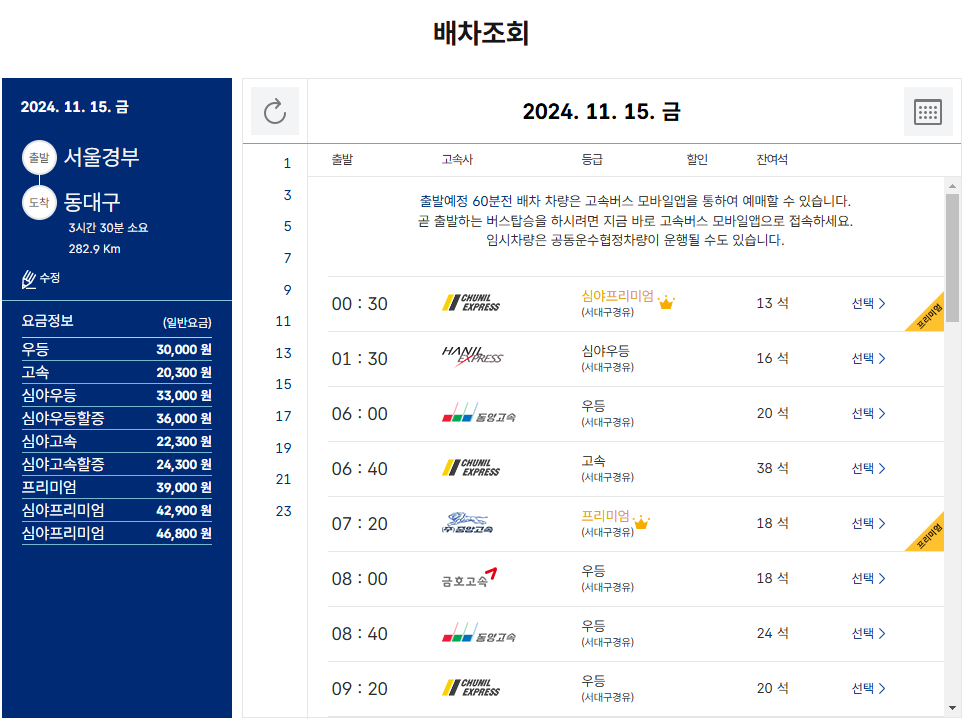 ● 고속버스터미널 시간표 조회가 완료 되면, 원하는 시간표와 버스등급을 선택합니다.