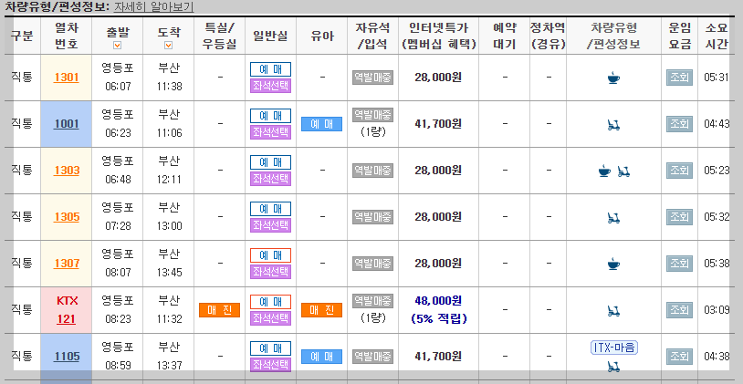 [특실 / 우등실 / 일반실 / 유아 / 자유석 / 입석] 등 자세한 정보를 확인합니다.
