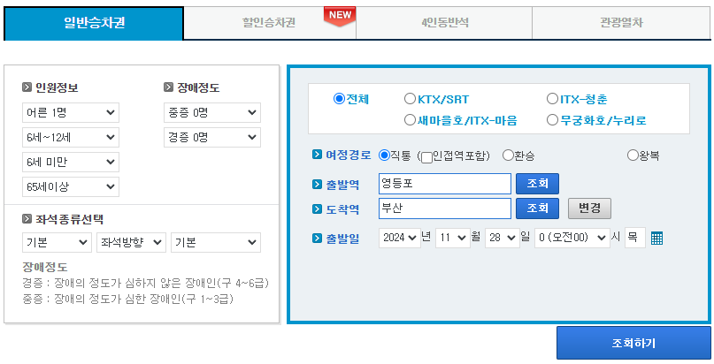 승차권 예매 페이지를 큰 화면으로 다시 한번 자 자세하게 보여줍니다.