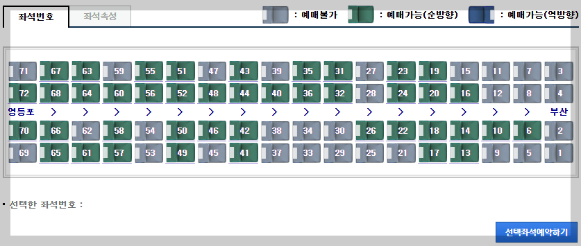 예매 가능한 방향이 순방향 / 역방향 좌석을 색깔로 구분하여 조회가 가능합니다