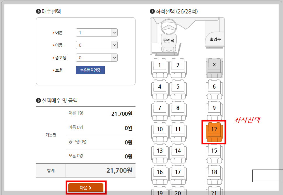 원하는 시간대의 버스를 선택하면, 화면에 보이는 것처럼 좌석 선택을 의자 이미지 중