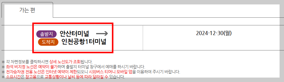 3️⃣ 출발이 가능한 시간대를 확인 및 잔여좌석을 체크합니다.