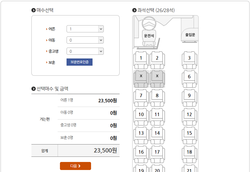 원하는 시간대의 버스를 선택하면, 좌석 선택을 의자 이미지에서 직접 선택할 수 있습니다.