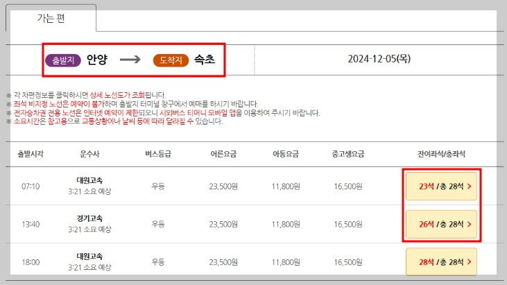 특히, 출발 시간이 임박했거나 인기 있는 노선의 경우 빠르게 매진될 수 있으니,