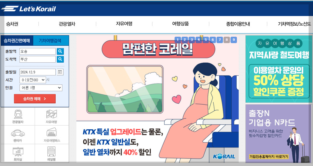 화면의 좌측 코너에 [승차권 간편예매]하기 화면에서 출발역 / 도착역 / 출발일을 설정해 보세요.