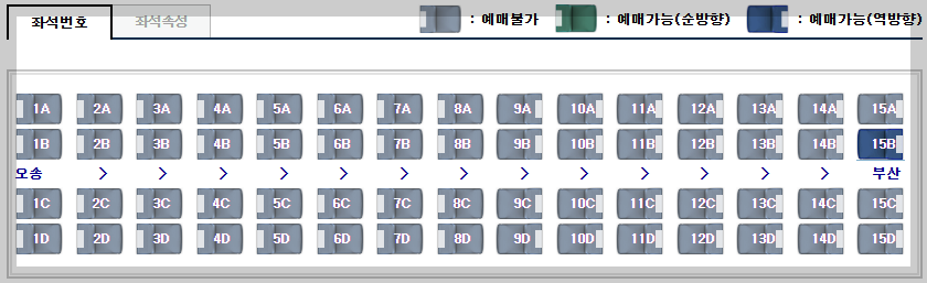 예매 가능한 방향이 순방향 / 역방향 좌석을 색깔로 구분하여 조회가 가능합니다