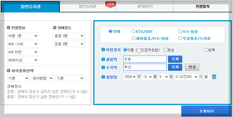 승차권 예매 페이지를 큰 화면으로 다시 한번 자세하게 보여주는데요.