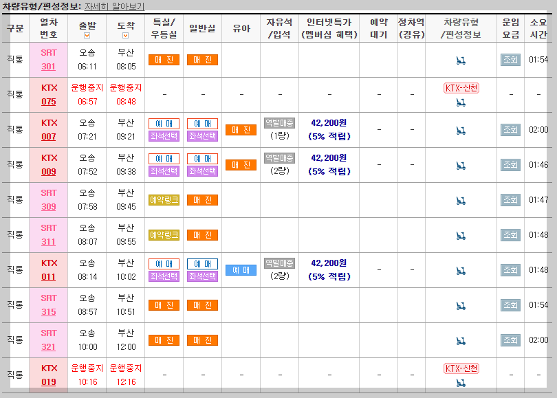 [특실 / 우등실 / 일반실 / 유아 / 자유석 / 입석] 등 자세한 정보를 확인합니다.