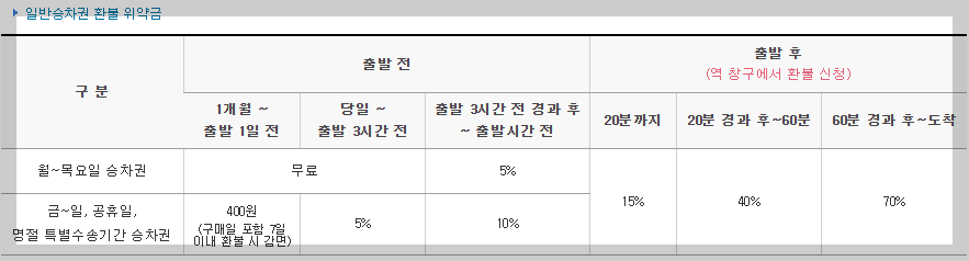 KTX 일반 승차권 환불 수수료 규정 안내