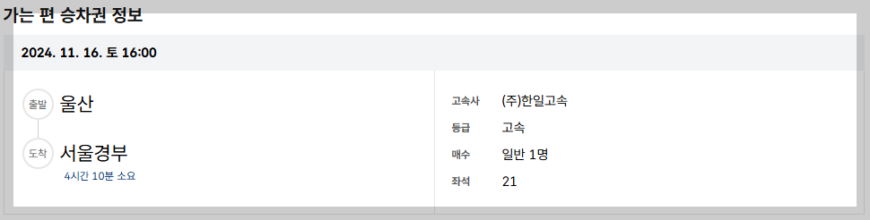 ● 출발일자의 시간대별 등급별 버스 시간표 및 좌석 정보를 확인할 수 있습니다.