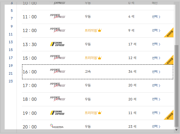 ● 고속버스터미널 시간표 조회가 완료 되면, 원하는 시간표와 버스등급을 선택합니다.