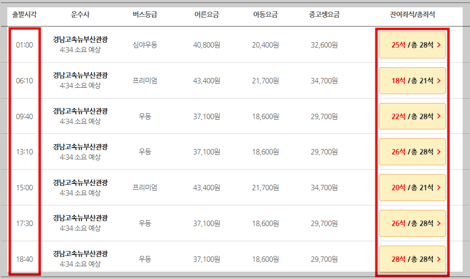 3️⃣ 출발이 가능한 시간대를 확인 및 잔여좌석을 체크합니다.