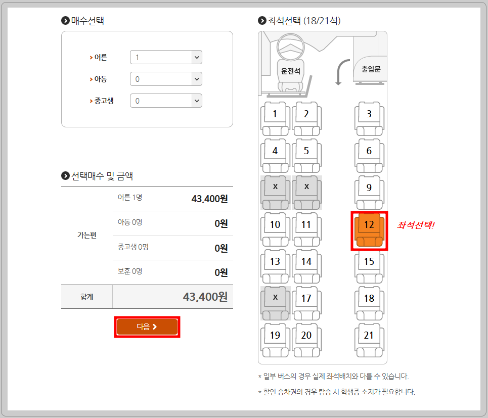 원하는 시간대의 버스를 선택하면, 화면에 보이는 것처럼 좌석 선택을 의자 이미지 중