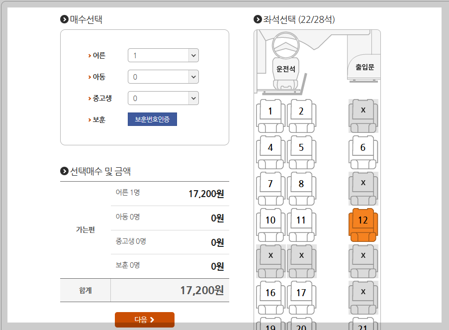 원하는 시간대의 버스를 선택하면, 좌석 선택을 의자 이미지에서 직접 선택할 수 있습니다.