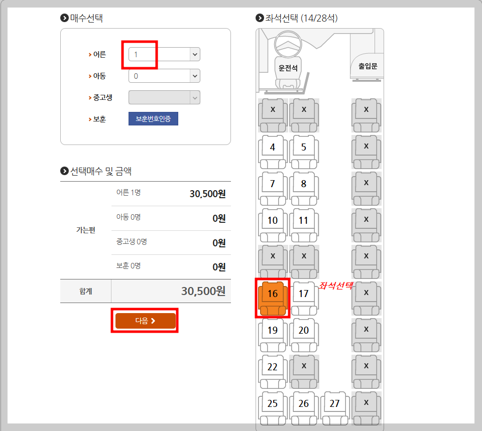 원하는 시간대의 버스를 선택하면, 화면에 보이는 것처럼 좌석 선택을 의자 이미지 중