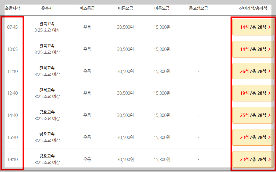 3️⃣ 출발이 가능한 시간대를 확인 및 잔여좌석을 체크합니다.