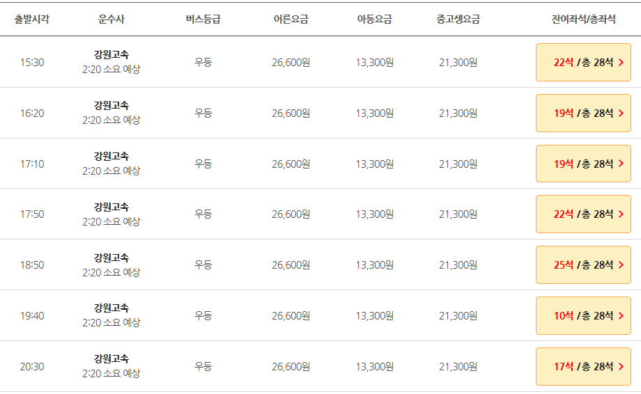 - 출발이 가능한 시간대를 확인하고, 잔여좌석 비교체크한 후, 원하는 시간대를 선택합니다.