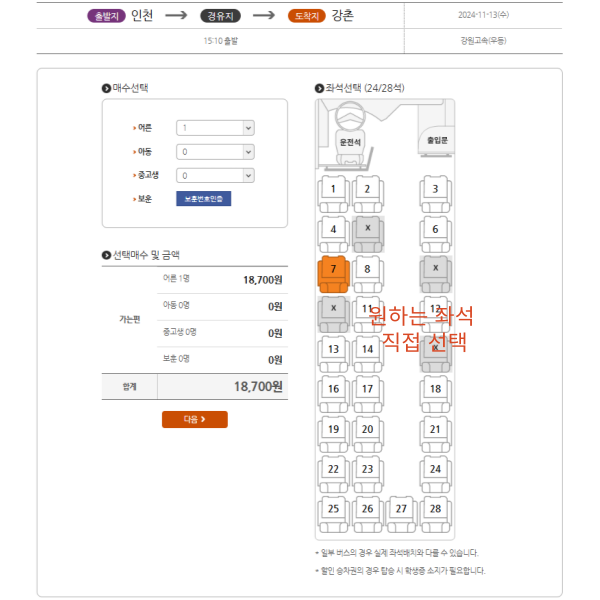원하는 시간대의 버스를 선택했다면, 원하는 좌석을 클릭 한 번으로 선택할 수 있는데요.