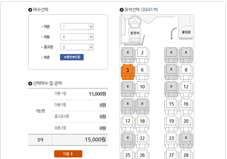 ● 원하는 시간대의 버스를 선택했다면, 원하는 좌석을 클릭 한 번으로 선택할 수 있는데요.