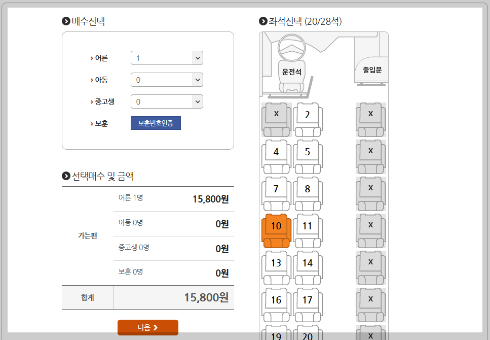 원하는 시간대의 버스를 선택하면, 좌석 선택을 의자 이미지에서 직접 선택할 수 있습니다.