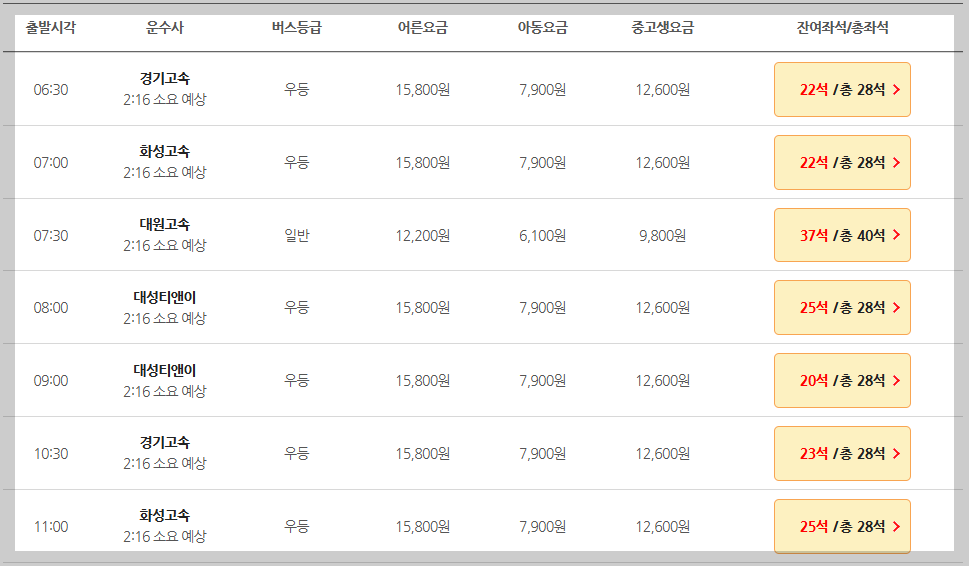 출발이 가능한 시간대를 확인 및 잔여좌석을 체크합니다.