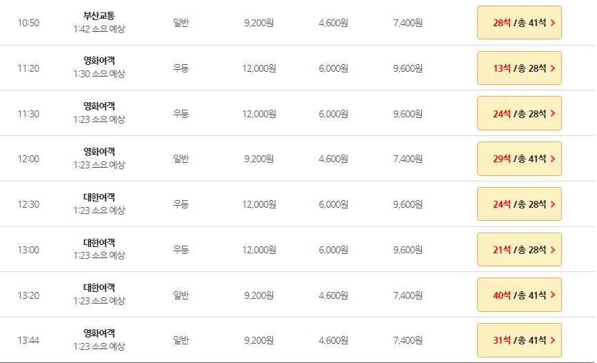 ● 출발이 가능한 시간대를 확인하고, 잔여좌석 비교체크한 후, 원하는 시간대를 선택합니다.