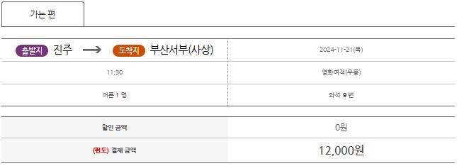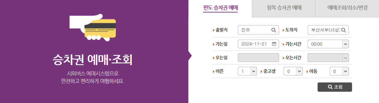 ● 예매 화면에서 출발지를 진주로 설정하고, 도착지를 각각 입력하고 조회 버튼을 누르면,