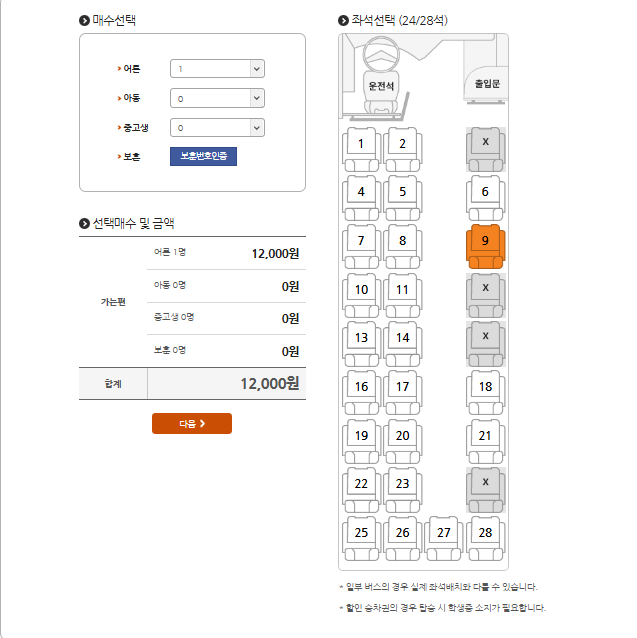 ● 원하는 시간대의 버스를 선택했다면, 원하는 좌석을 클릭 한 번으로 선택할 수 있는데요.