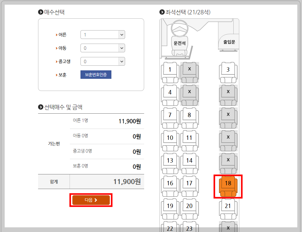 원하는 시간대의 버스를 선택하면, 화면에 보이는 것처럼 좌석 선택을 의자 이미지 중