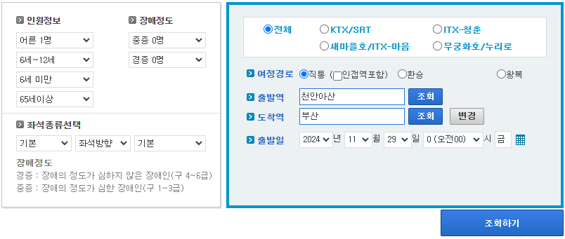 승차권 예매 페이지를 큰 화면으로 다시 한번 자 자세하게 보여줍니다.