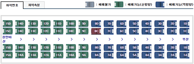 예매 가능한 방향이 순방향 / 역방향 좌석을 색깔로 구분하여 조회가 가능합니다