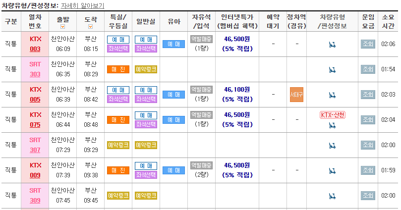 [특실 / 우등실 / 일반실 / 유아 / 자유석 / 입석] 등 자세한 정보를 확인합니다.