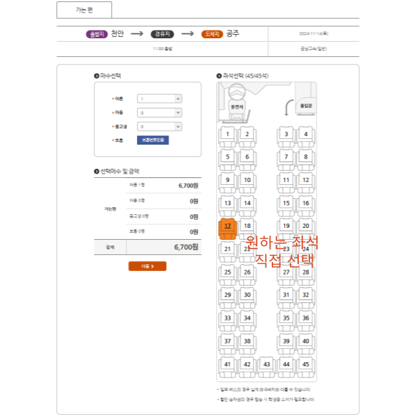 원하는 시간대의 버스를 선택했다면, 원하는 좌석을 클릭 한 번으로 선택할 수 있는데요.