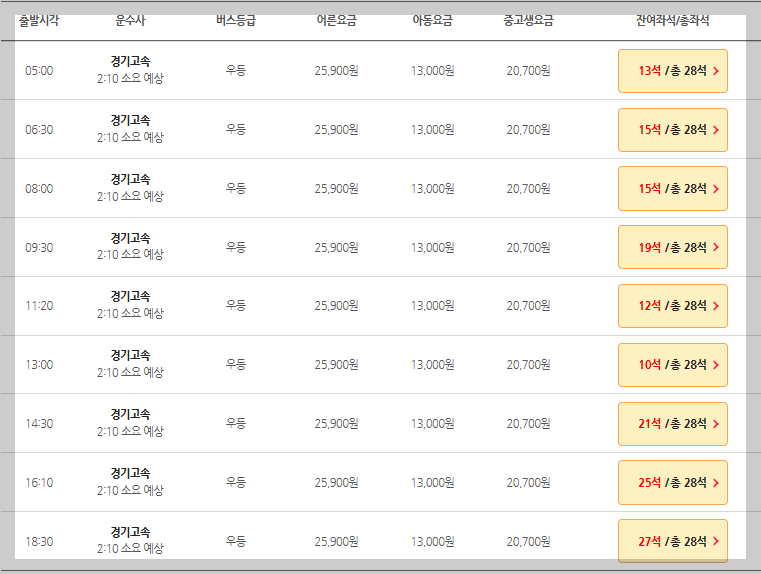 해당날짜에 출발하는 배차시간을 모두 확인할 수 있습니다.