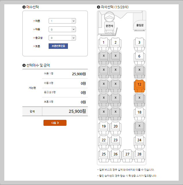 ● 원하는 시간대의 버스를 선택했다면, 원하는 좌석을 클릭 한 번으로 선택할 수 있는데요.