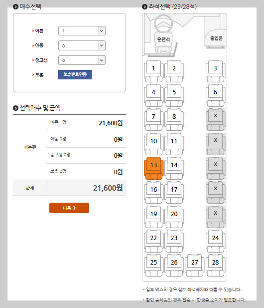 ● 원하는 시간대의 버스를 선택했다면, 원하는 좌석을 클릭 한 번으로 선택할 수 있는데요.