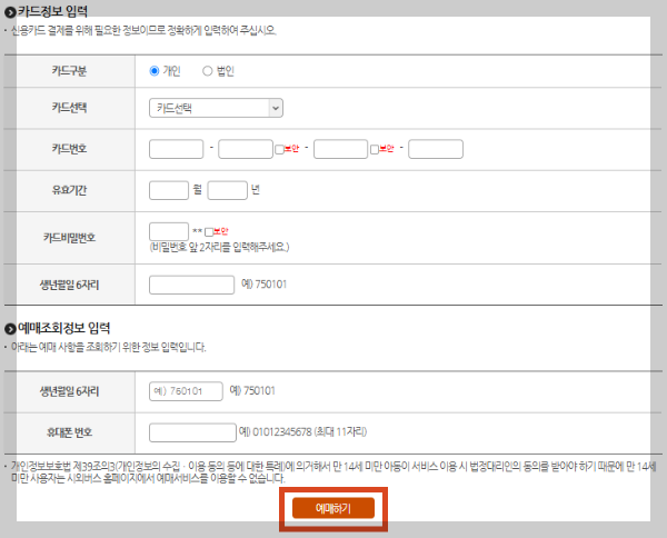 ● 예매 시 사용했던 정보 (카드번호 / 휴대폰 번호 등)를 입력하여 예매 내역을 조회합니다.