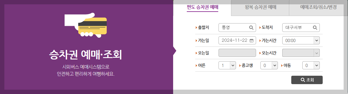 ● 예매 화면에서 출발지를 "통영"으로 설정하고, 도착지를 각각 입력하고 조회 버튼을 누르면,